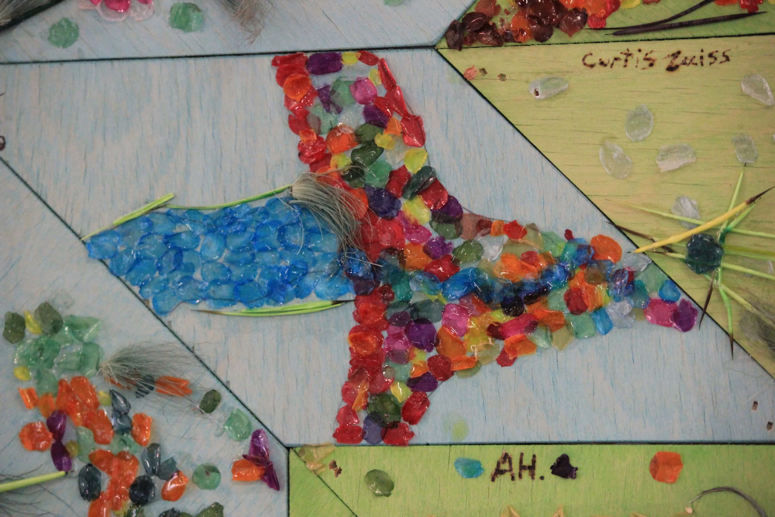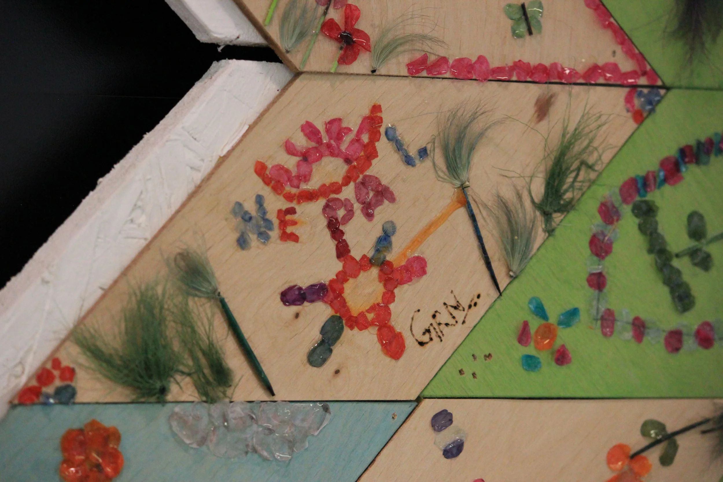 Dyed fish scales (walleye, white sucker), dyed porcupine quills, dyed caribou hair, reclaimed wood, acrylic paint, resin.