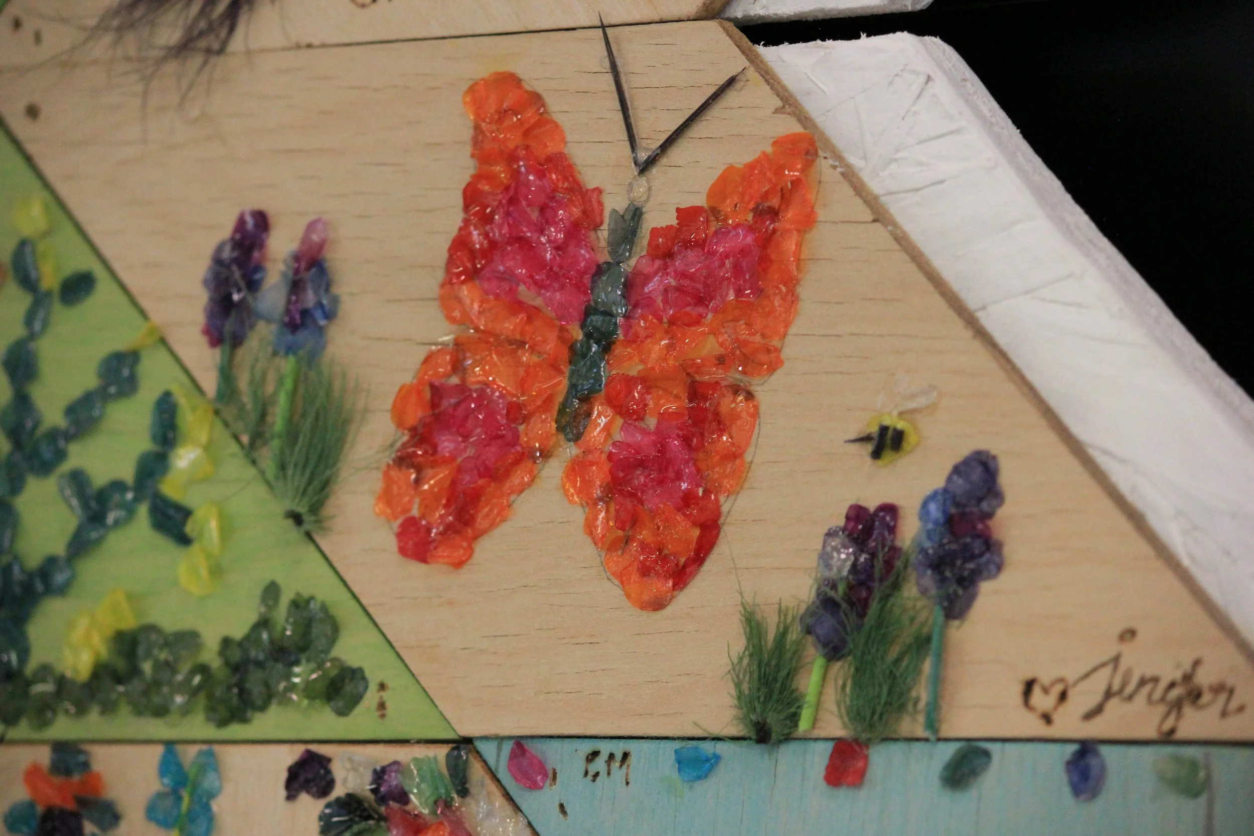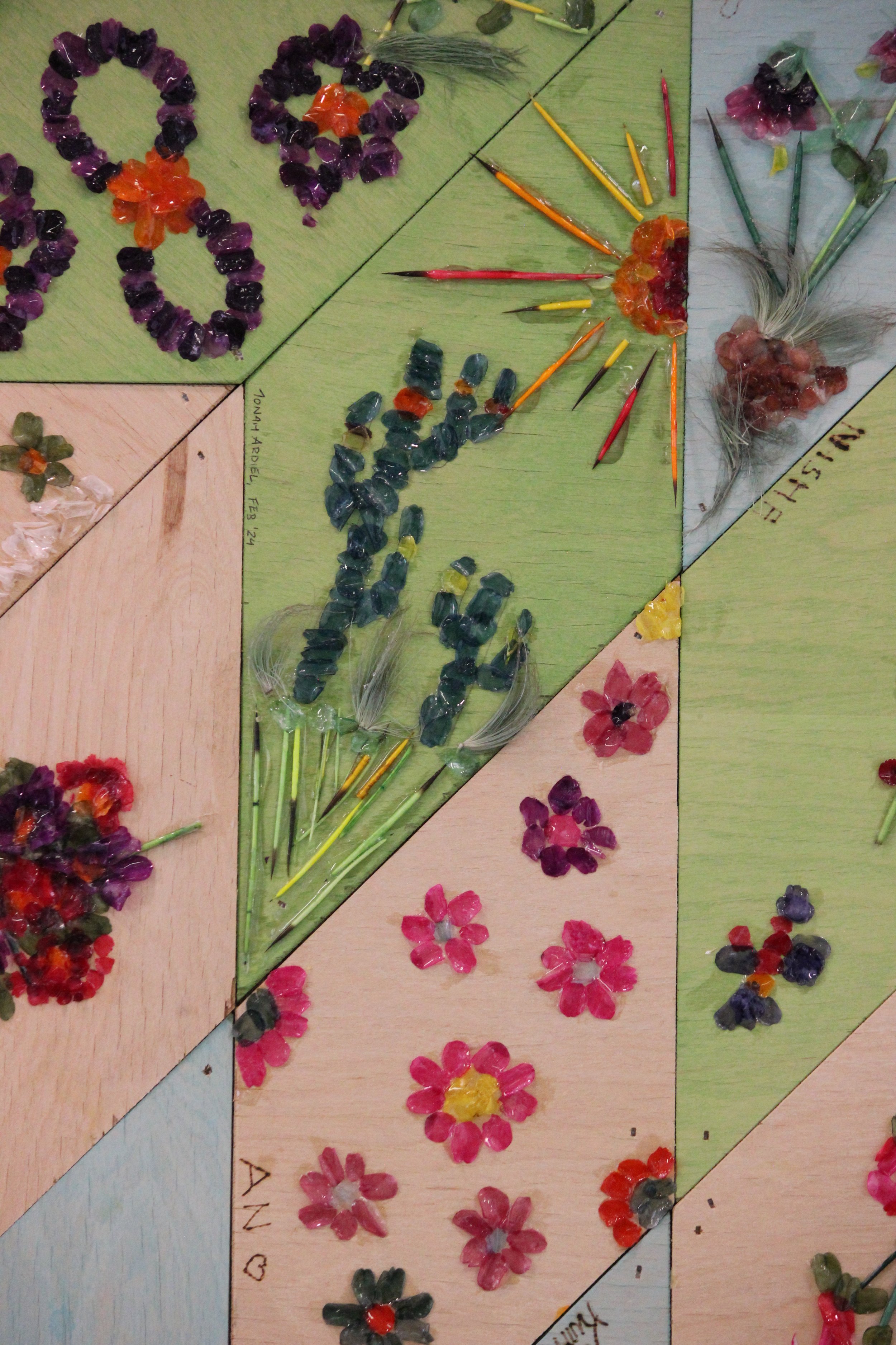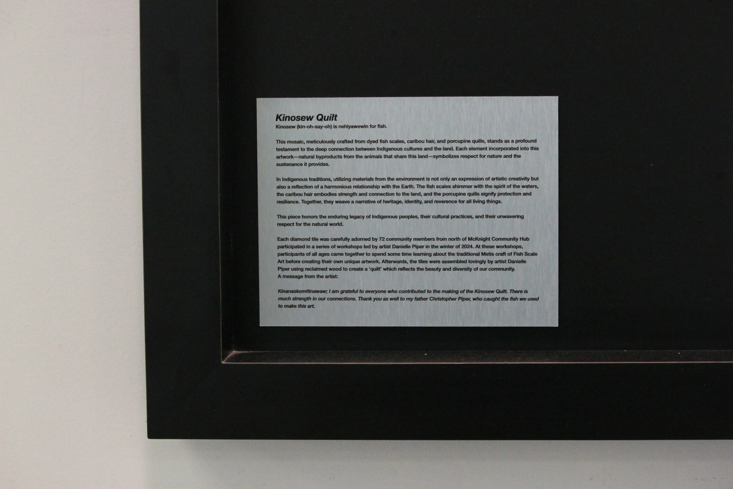 This is a collaborative piece of fish scale art, made for the Genesis Centre in NW Calgary. We held 2 workshops, hosting over 60 members of the community of all ages, in early 2024. Afterwards, I added a protective coating of resin and then pieced the 72 diamond tiles together, using the formation of the starblanket, to create a large 8-pointed star. There was an unveiling and Artist Talk at Genesis Centre in the spring of 2024. Kinosew Quilt now hangs permanently by the front desk of the Genesis Centre.